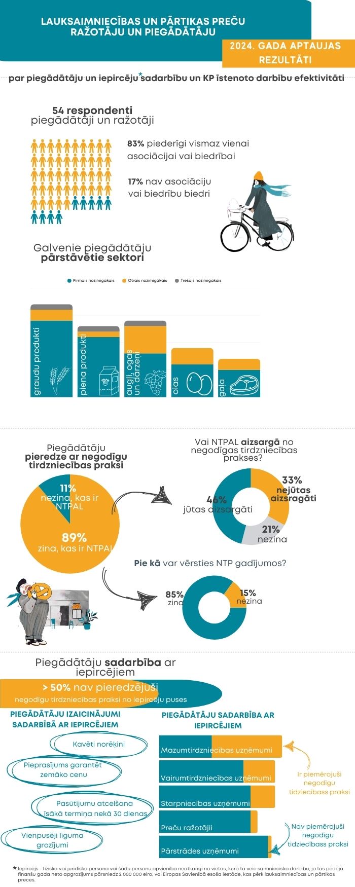 Kopā aptaujā piedalījās 54 piegādātāji no dažādām pārtikas nozarēm, tomēr visplašāk pārstāvētas bija piena produktu, gaļas un gaļas izstrādājumu, augļu, ogu un dārzeņu, kā arī graudaugu un miltu produktu nozares. Aptaujas rezultāti liecina, ka lielākā daļa respondentu (83%) ir piederīgi vismaz vienai no piegādātāju intereses pārstāvošajām asociācijām vai biedrībām, kas liecina par augstu asociāciju un biedrību organizētību un, iespējams, to pieaugošo nozīmi piegādātāju interešu aizstāvībā.